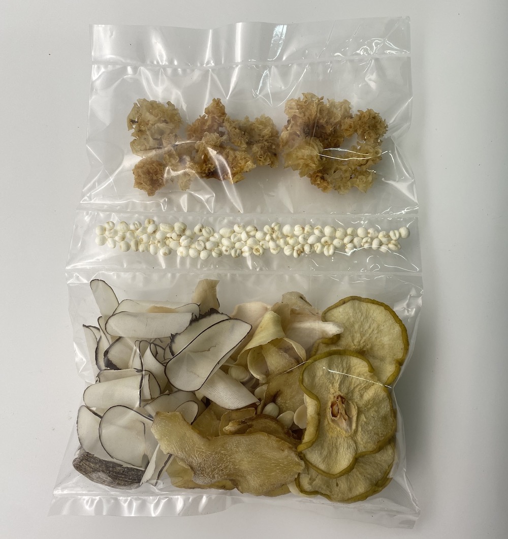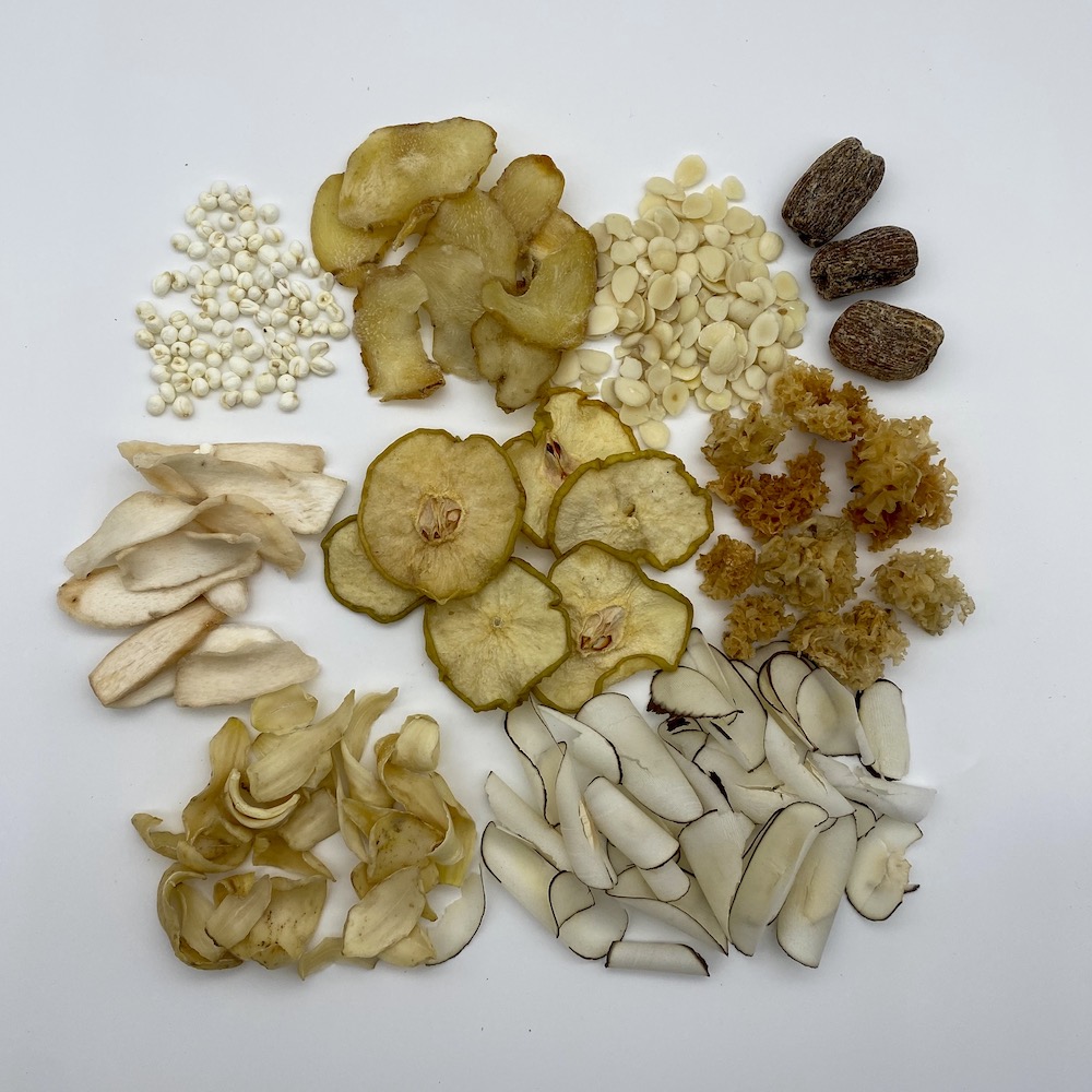 成份:川貝、椰片、淮山、海玉竹、雪梨乾、雪耳、百合、南北杏、蜜枣。